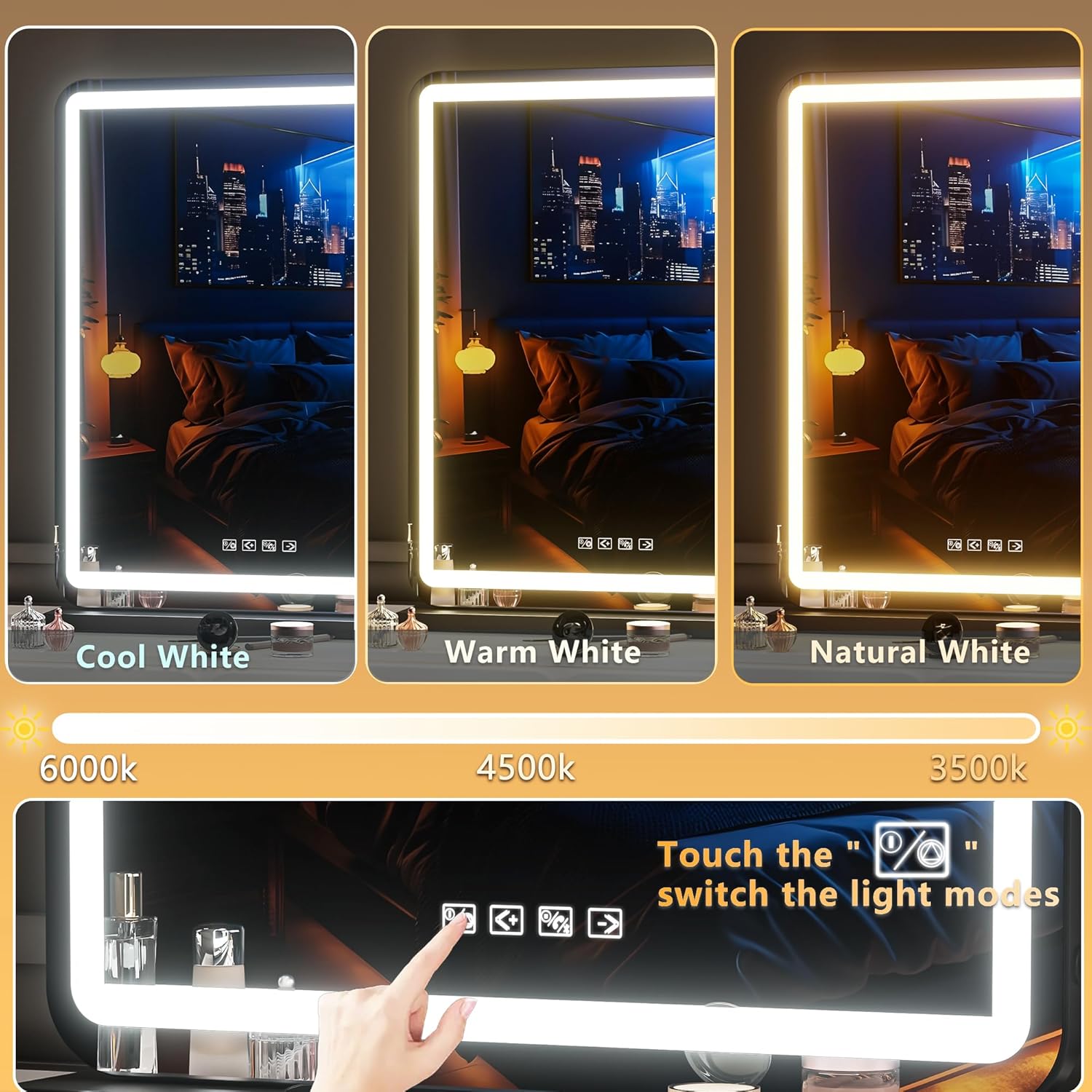 - 👍【Smart Touch Control & Memory Function】This makeup mirror with lights has 3 smart touch buttons, turn on/off the light by touching the sensor switch, Press left button to change the color modes, long press right button to adjust the led brightness. This lighted makeup mirror is specially designed memory functionfunction keep your lights setting like your last use.
