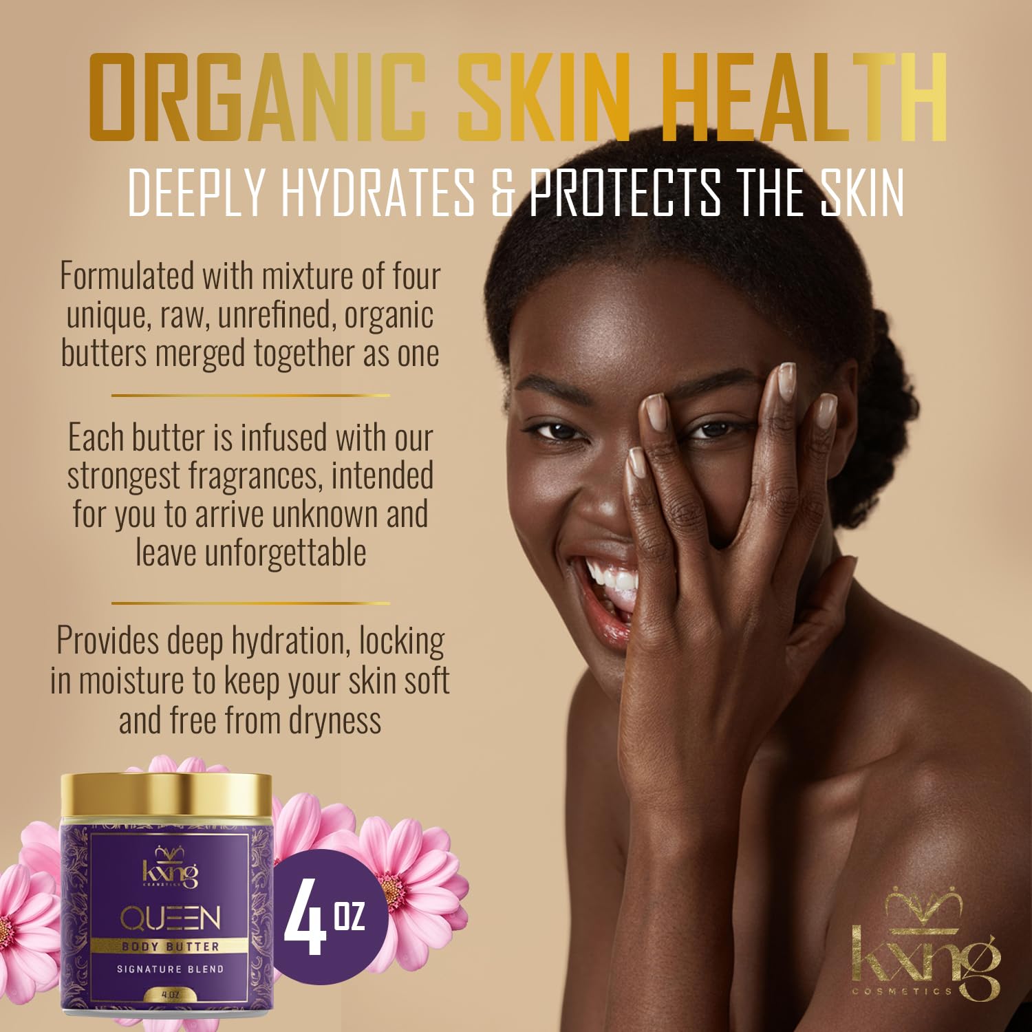 - PHEROMONE INFUSED - Body Butters, Creams, Lotions and Oils for Men by KXNG Cosmetics. Moisturize and nourish All Skin types: extremely dry skin, normal, oily, combination, mature, and sensitive. Organic Raw Shea Butter, Cocoa Butter, Mango Butter, Kokum Butter, Coconut Oil, Body, Hand, Foot.