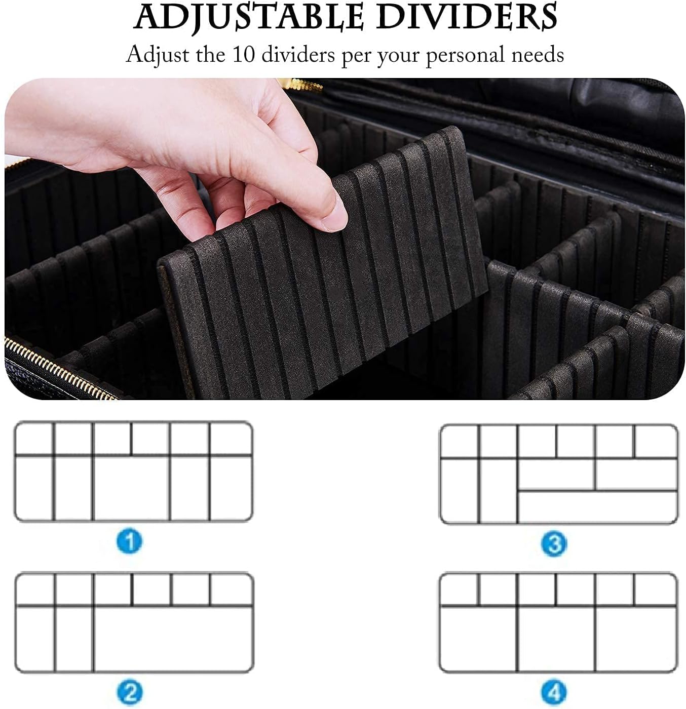• Customizable Compartments:This makeup travel case has 10 removable dividers and 12 makeup brushes slots. You can design the internal compartments by adjusting the dividers to fit different cosmetics and keep them perfectly separated and organized.
