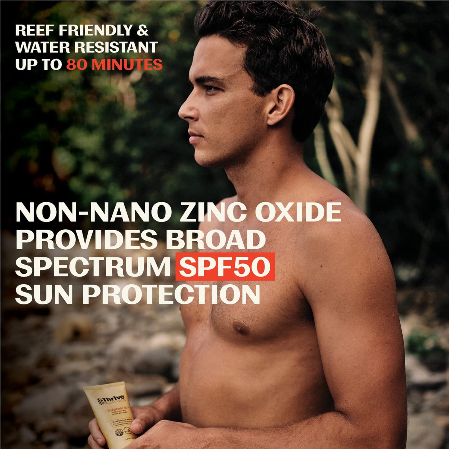 - NATURAL SPF PROTECTION - SPF 50 Sunscreen powered by Thriveβs antioxidant rich Costa Rican super-plants, Juanilama, Fierrillo & Coralillo, delivered in a tube made from recycled plastic, for a lighter environmental footprint. Our regenerative plant-derived formula helps restore skin from sun exposure.