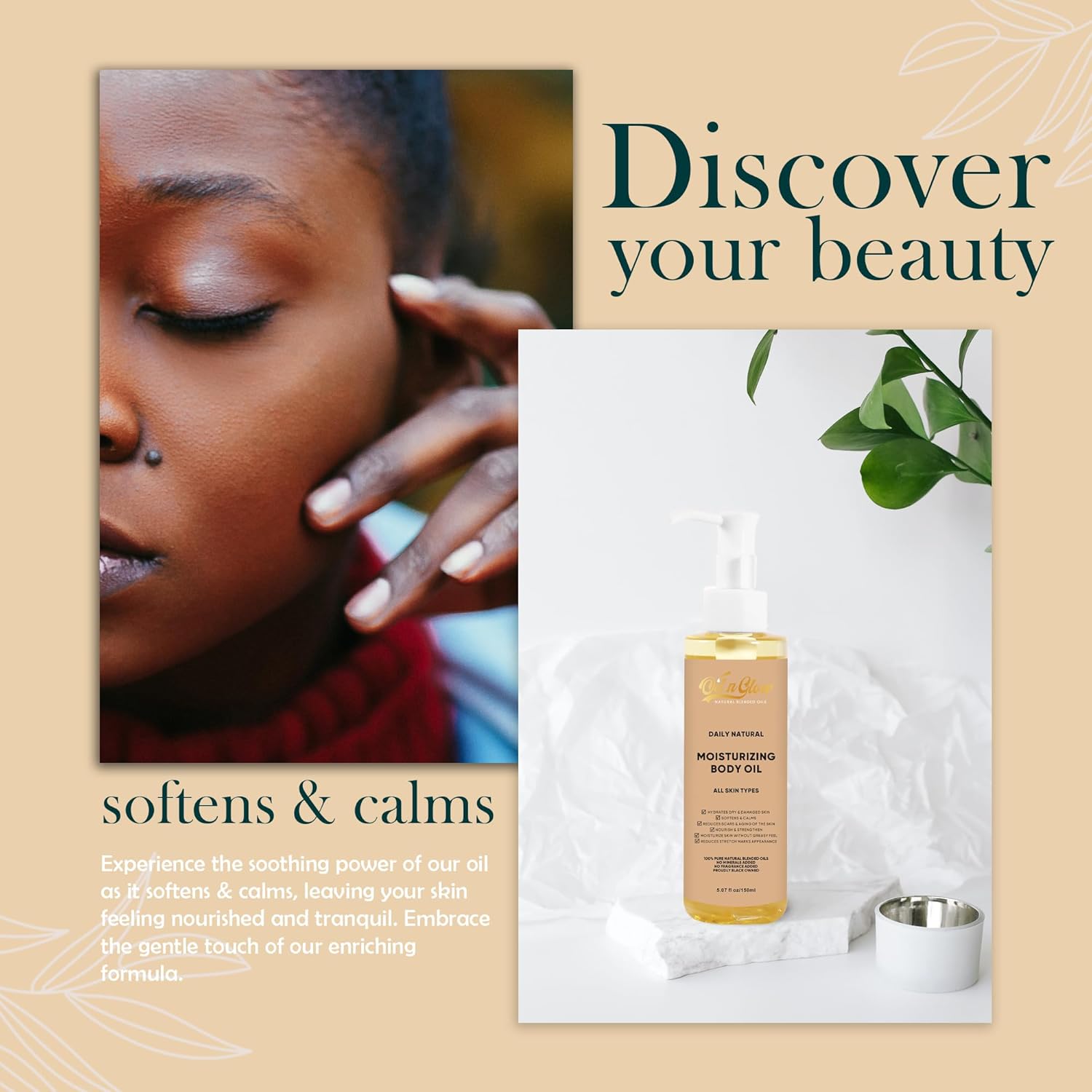 - DEEPLY HYDRATE AND MOISTURIZE: Quench your skin’s thirst with our hydrating body oil enriched with vitamin E oil, coconut oil, jojoba oil, olive oil, and almond oil. Designed to deeply nourish, this moisturizing body oil penetrates dry layers, reviving damaged skin while restoring its soft, supple glow. Perfect as a body oil after shower, it renews your skin without any greasy residue. Embrace the natural luxury of smooth, vibrant skin with our pure moisturizing oil for body.