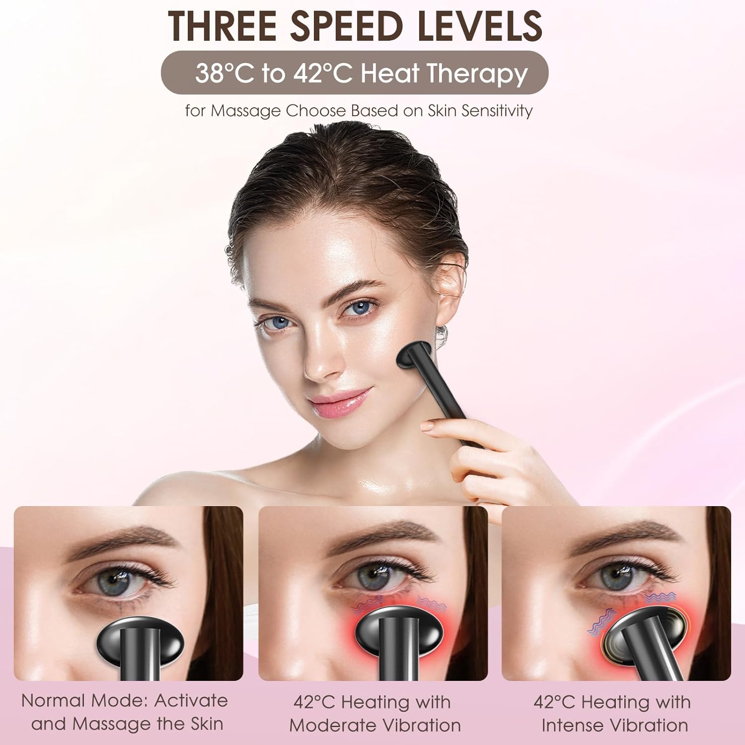 - Frequency Massage: The face light therapy device features three different frequency massage modes, combined with thermal therapy (38-42°C). Choose the appropriate frequency of massage based on skin tolerance, and promote skin absorption through massage to make the skin smooth, firm, and elastic.