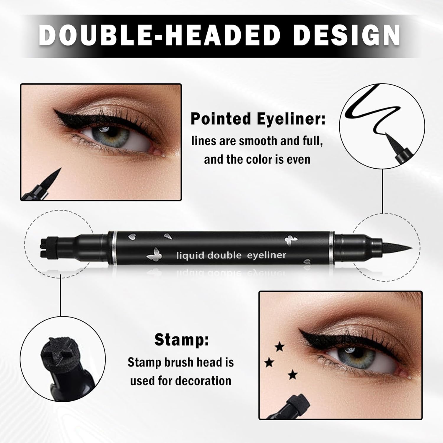 - DOUBLE-HEADED DESIGN: Eyeliner stamp adopts double-headed design, one side is a delicate eyeliner, the other side is a creative stamp, which can easily draw precise and smooth eyeliner, helping you create different styles of eye makeup